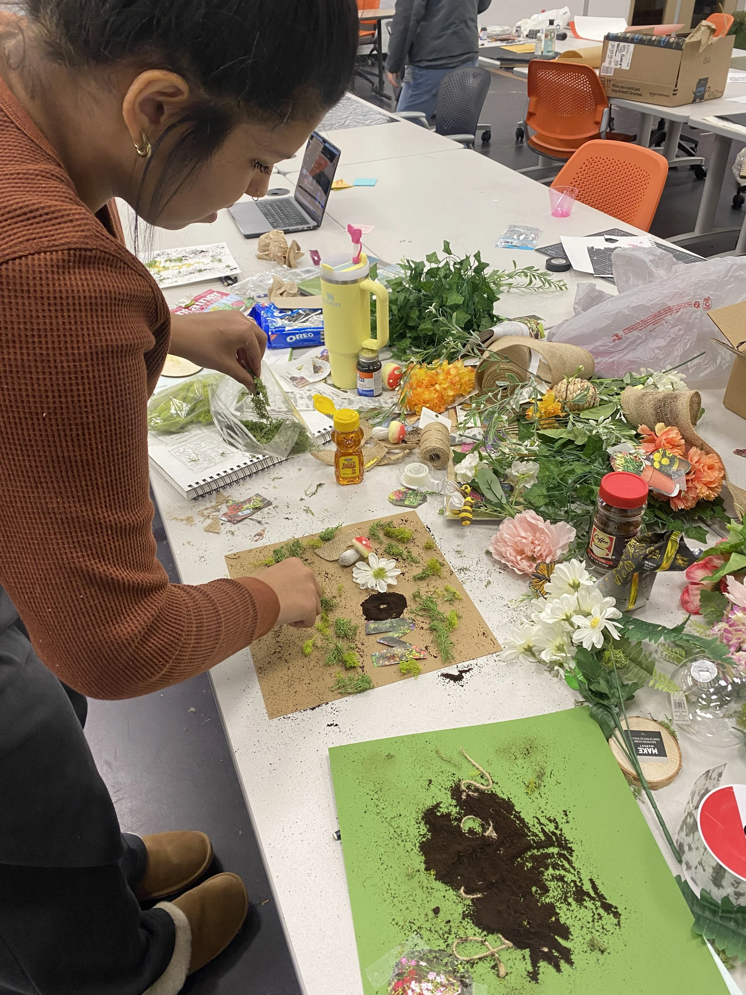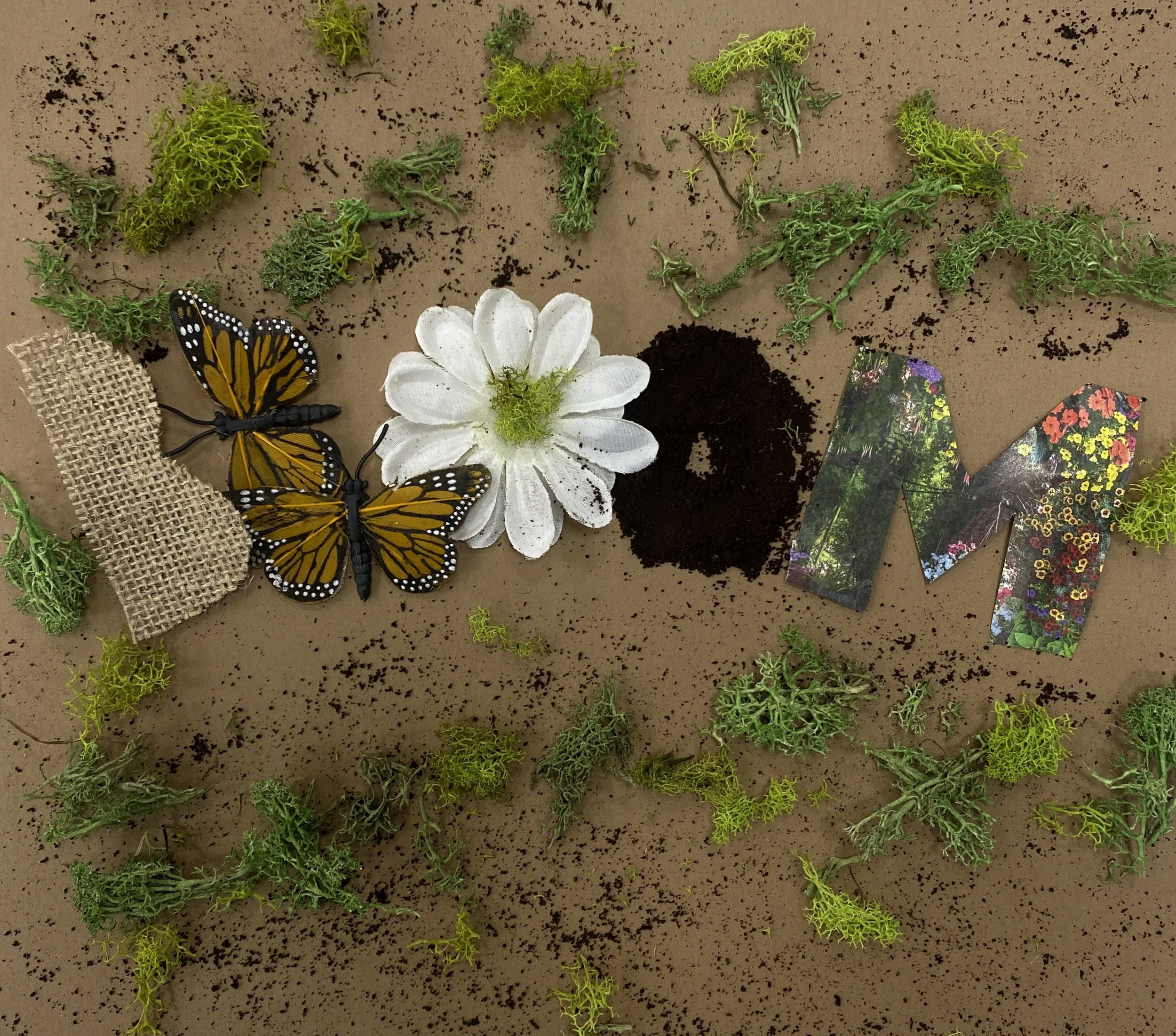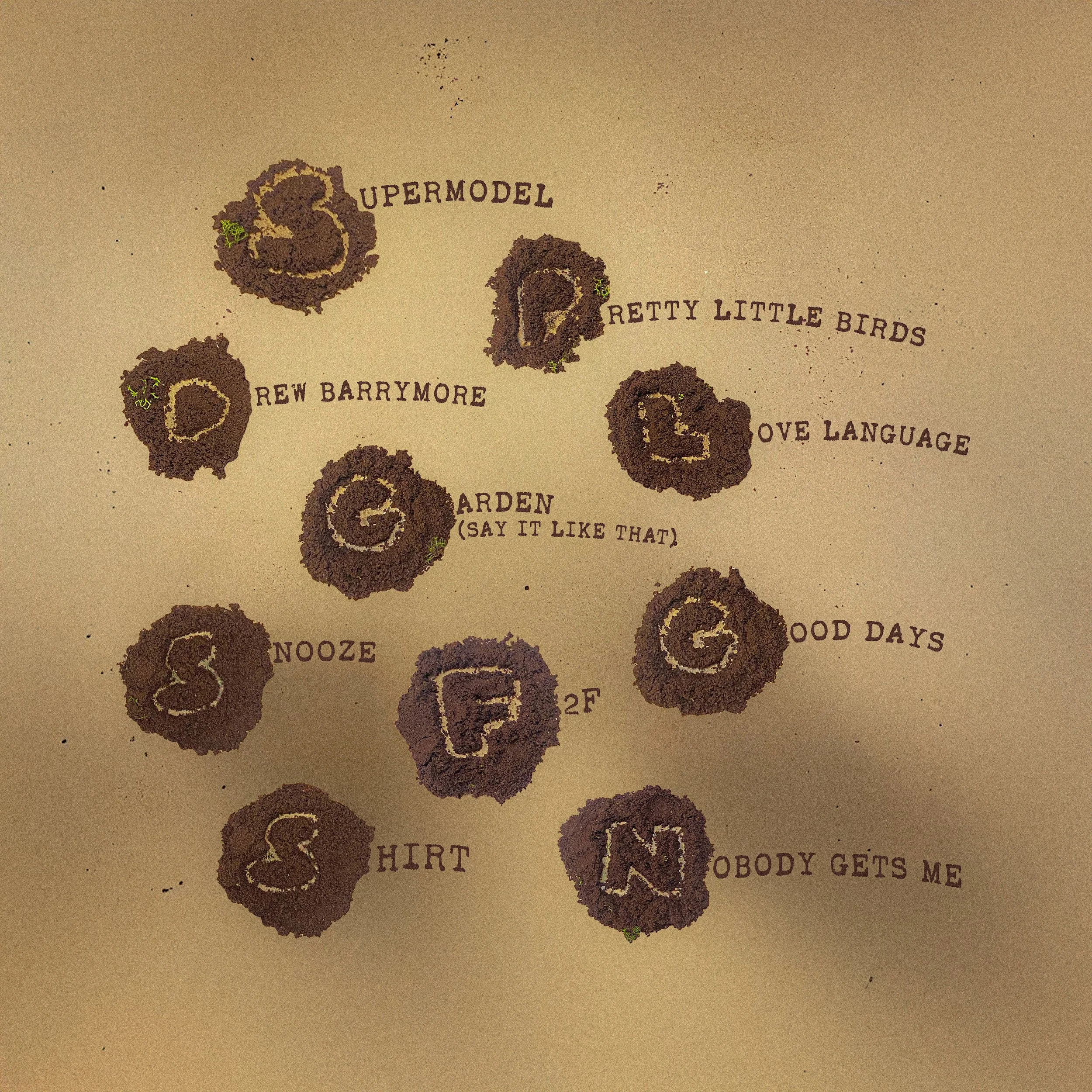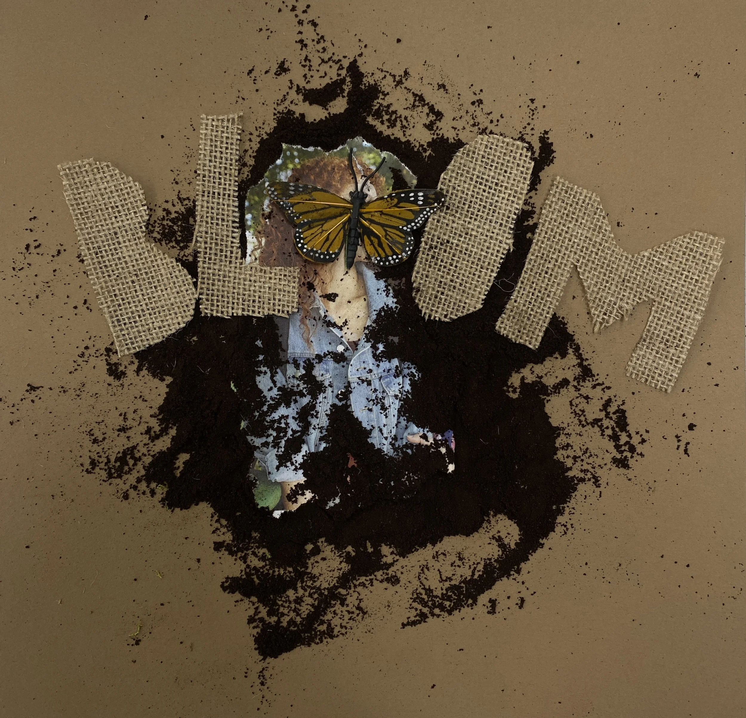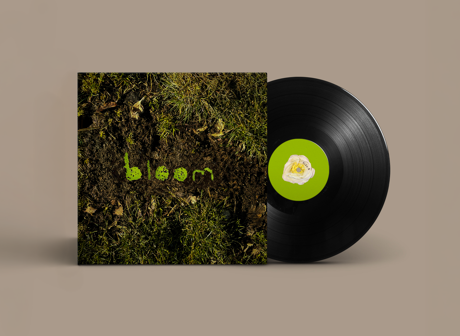 The process began with sketching and material exploration, focusing on how natural elements could communicate growth beyond literal imagery. Early concepts relied heavily on floral visuals, but through critique, the direction shifted toward a more tactile, symbolic approach. I experimented with layering materials like coffee grounds and paper to build texture and depth, refining composition and contrast between the muted exterior and vibrant interior. The final design was assembled by hand, creating a cohesive visual narrative that unfolds as the vinyl is opened.