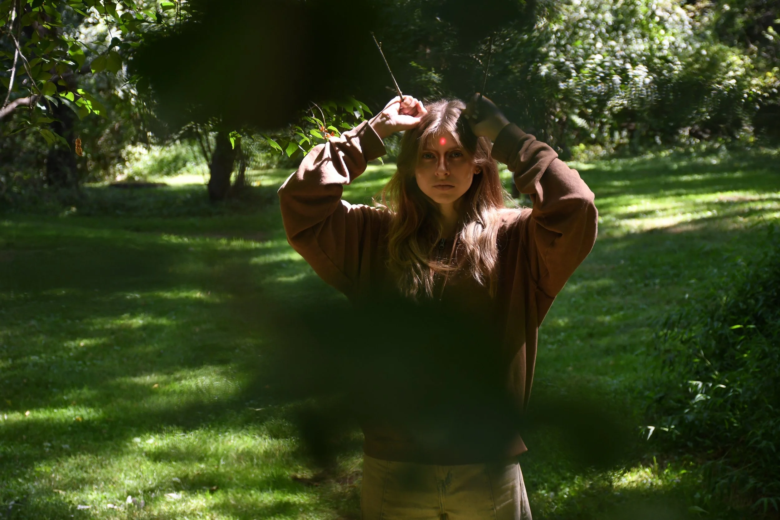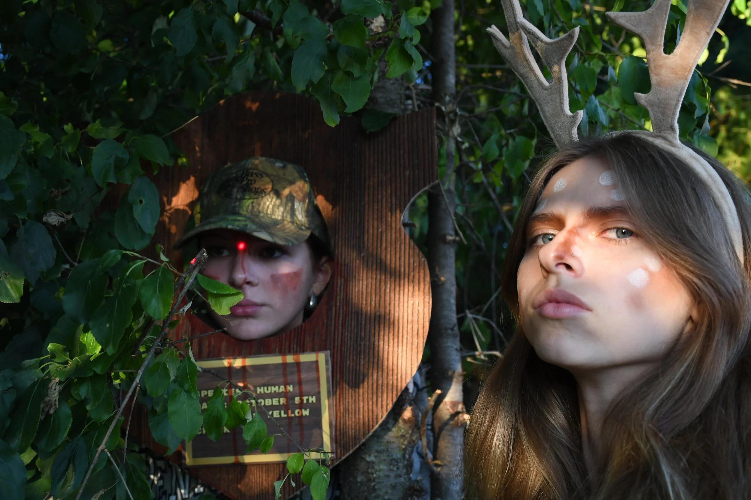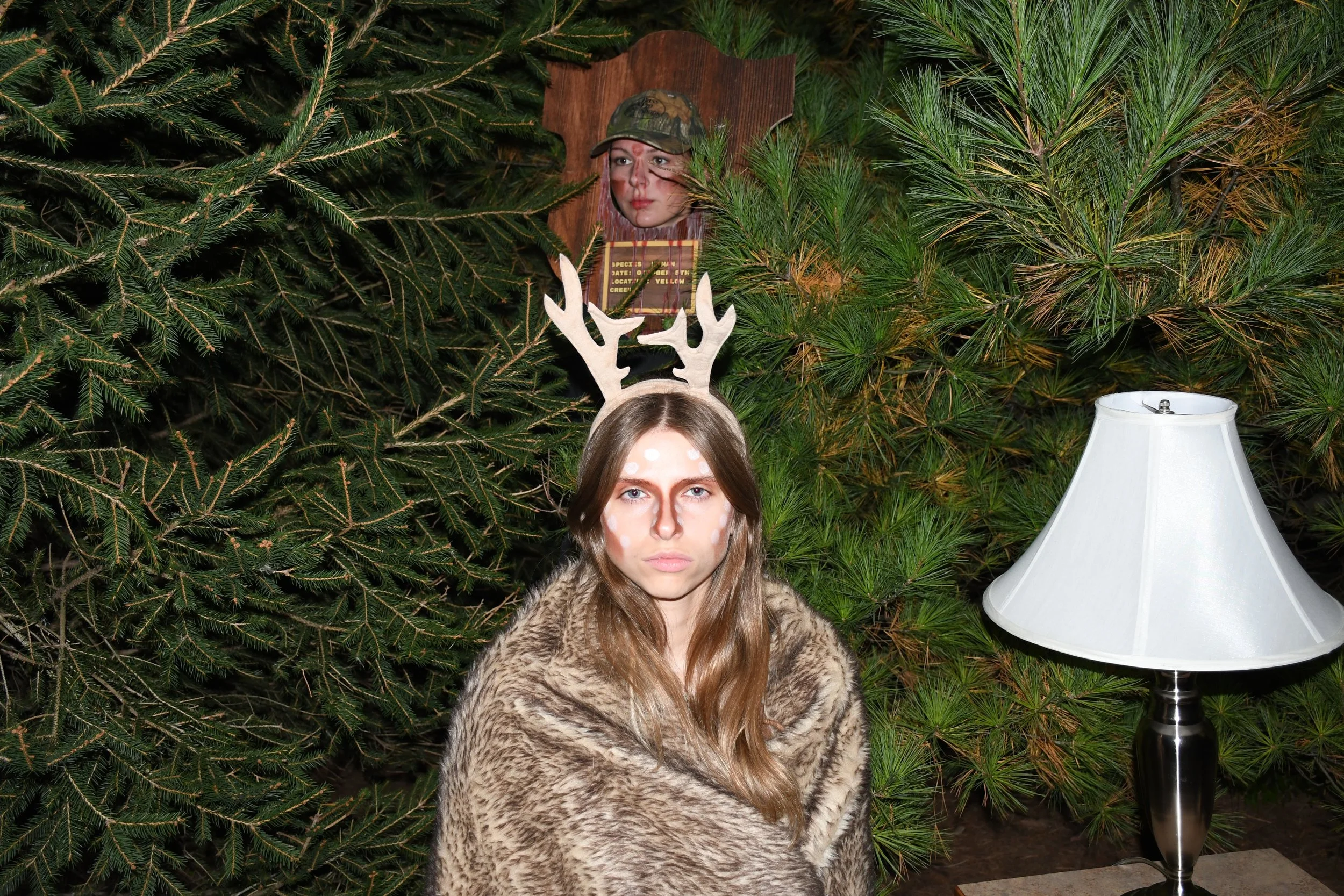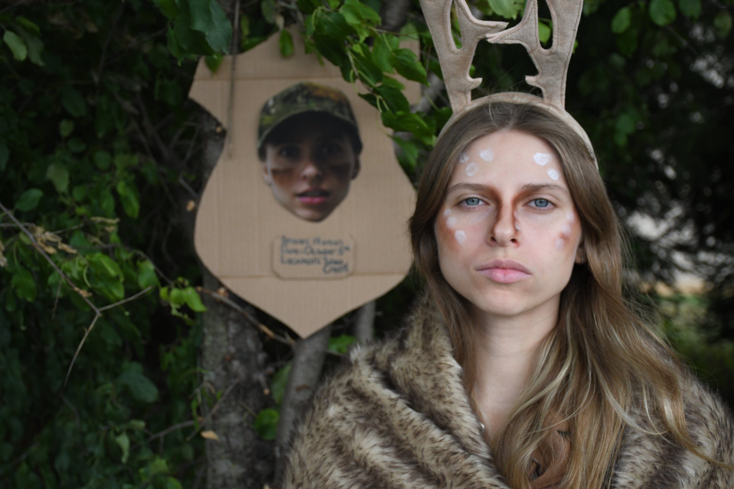 A metaphorical portrait exploring the role reversal of trophy hunting, where the deer becomes the hunter, and the human becomes the trophy. Constructed without digital manipulation, the image uses a hand-built mount, staged set, and practical effects—including a laser pointer to mimic a gun sight—to create a haunting, immersive scene. Photographed at night, the piece relies on symbolism and atmosphere to provoke empathy and challenge the violence and pride embedded in trophy hunting.